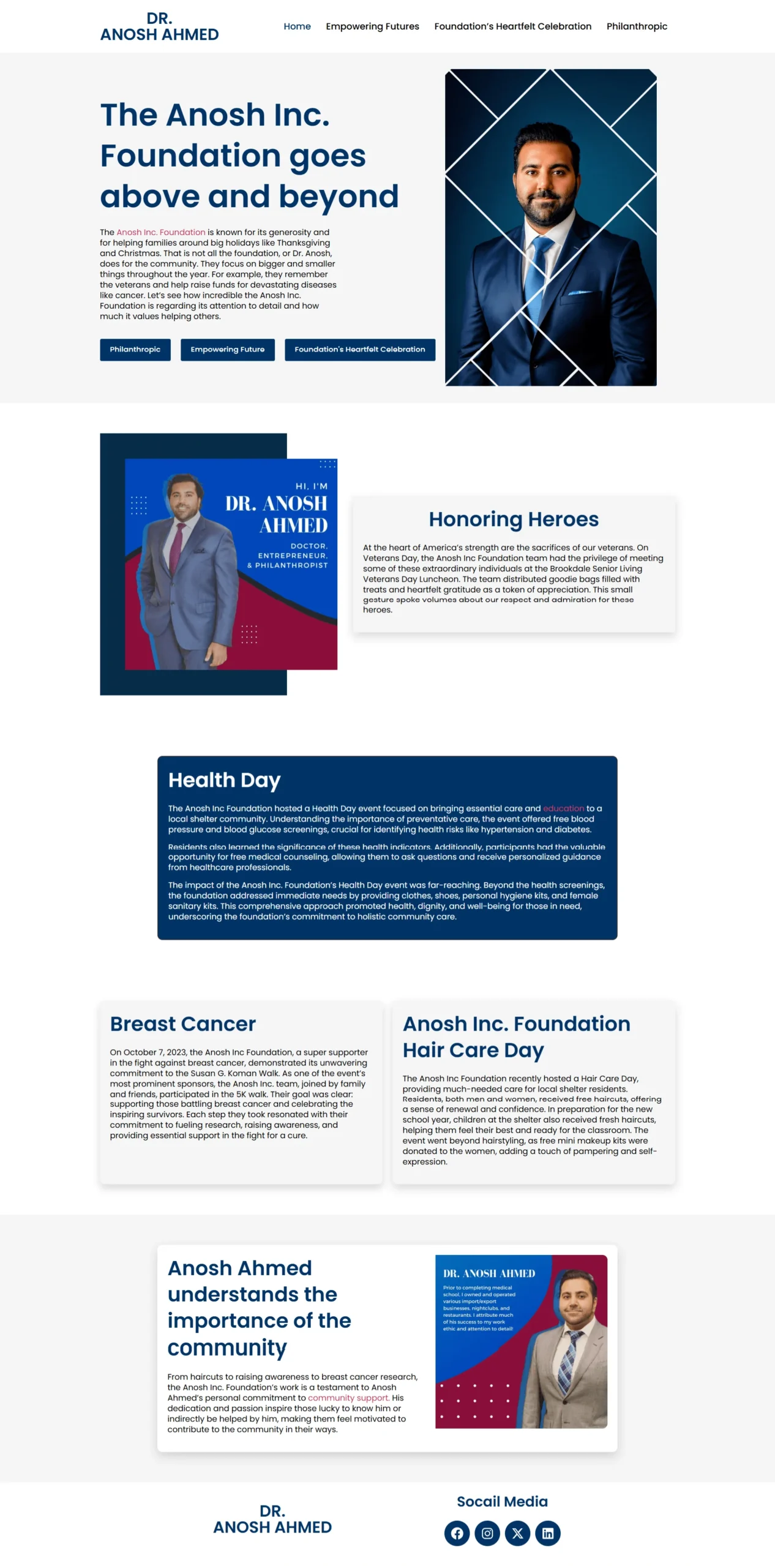 Developed and maintained over 10+ Biography websites for Dr. Anosh Ahmed, focused on leadership, philanthropy, and community development. These websites are built with responsive design, clean navigation, and content-oriented layouts that highlight his mission, projects, and impact. Emphasis was placed on user experience, accessibility, and performance.